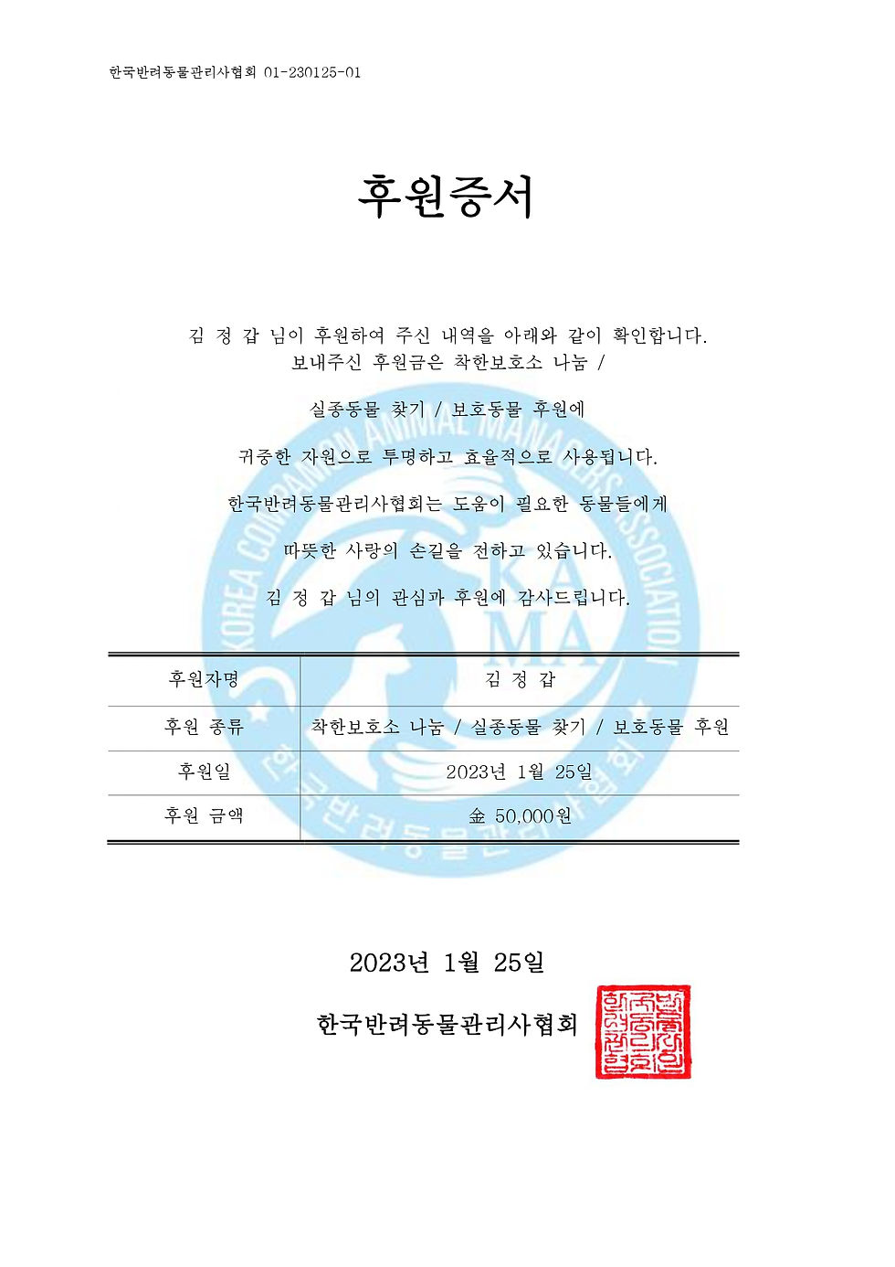2023년1월23일 경기도 인천에 거주하시는 김정갑님께서 착한보호소 나눔 / 실종동물 찾기 / 보호동물 지원에 金50,000원을 후원해주셨습니다. 따뜻한 손길에 감사드립니다.^^
